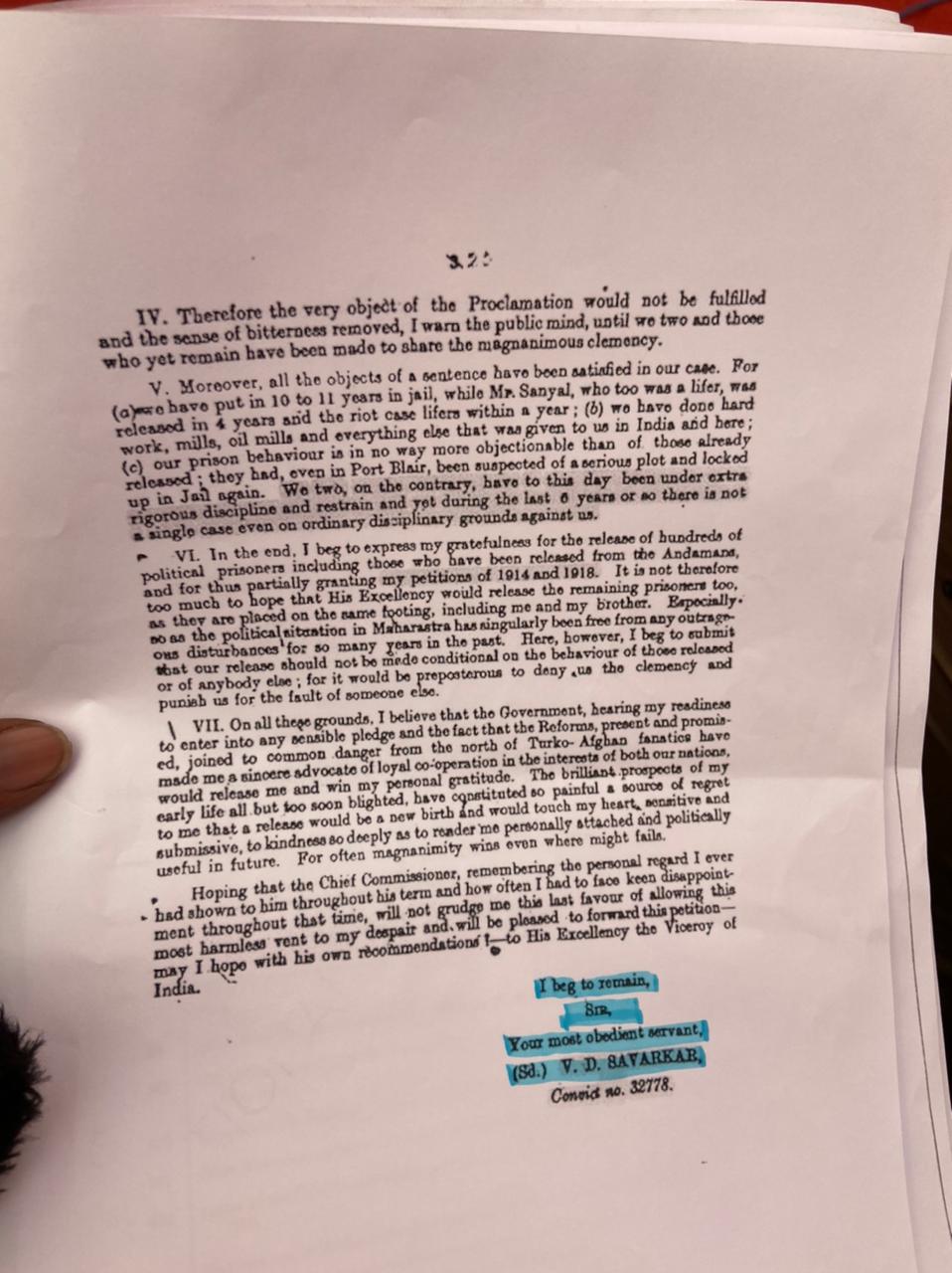 താൻ ബ്രിട്ടീഷുകാരന്റെ സേവകനാകാൻ യാചിക്കുന്നുവെന്ന വി.ഡി സവർക്കറുടെ കത്തുമായി കോൺഗ്രസ് നേതാവ് രാഹുൽഗാന്ധി രംഗത്തെത്തിയിരുന്നു. ഭാരത് ജോഡോ യാത്രയുടെ ഭാഗമായി മഹാരാഷ്ട്രയിലെ അകോളയിൽ നടത്തിയ വാർത്താസമ്മേളനത്തിലാണ് രാഹുൽ കത്ത് പ്രദർശിപ്പിച്ചത്. ഇതെനിക്ക് വളരെ പ്രധാനപ്പെട്ട രേഖയാണെന്ന് പറഞ്ഞായിരുന്നു സവർക്കറിനെ വിമർശിച്ചതിന്റെ പേരിൽ കുറ്റപ്പെടുത്തപ്പെടുന്ന അദ്ദേഹത്തിന്റെ ഇടപെടൽ. 'സാർ, ഞാൻ അങ്ങയുടെ വിനീത സേവകനായി തുടരാൻ യാചിക്കുന്നു' ഇംഗ്ലീഷുകാർക്കായി സവർക്കർ എഴുതിയ കത്തിന്റെ അവസാന വരിയിലെ വാക്കുകൾ രാഹുൽ ഉദ്ധരിച്ചു.
