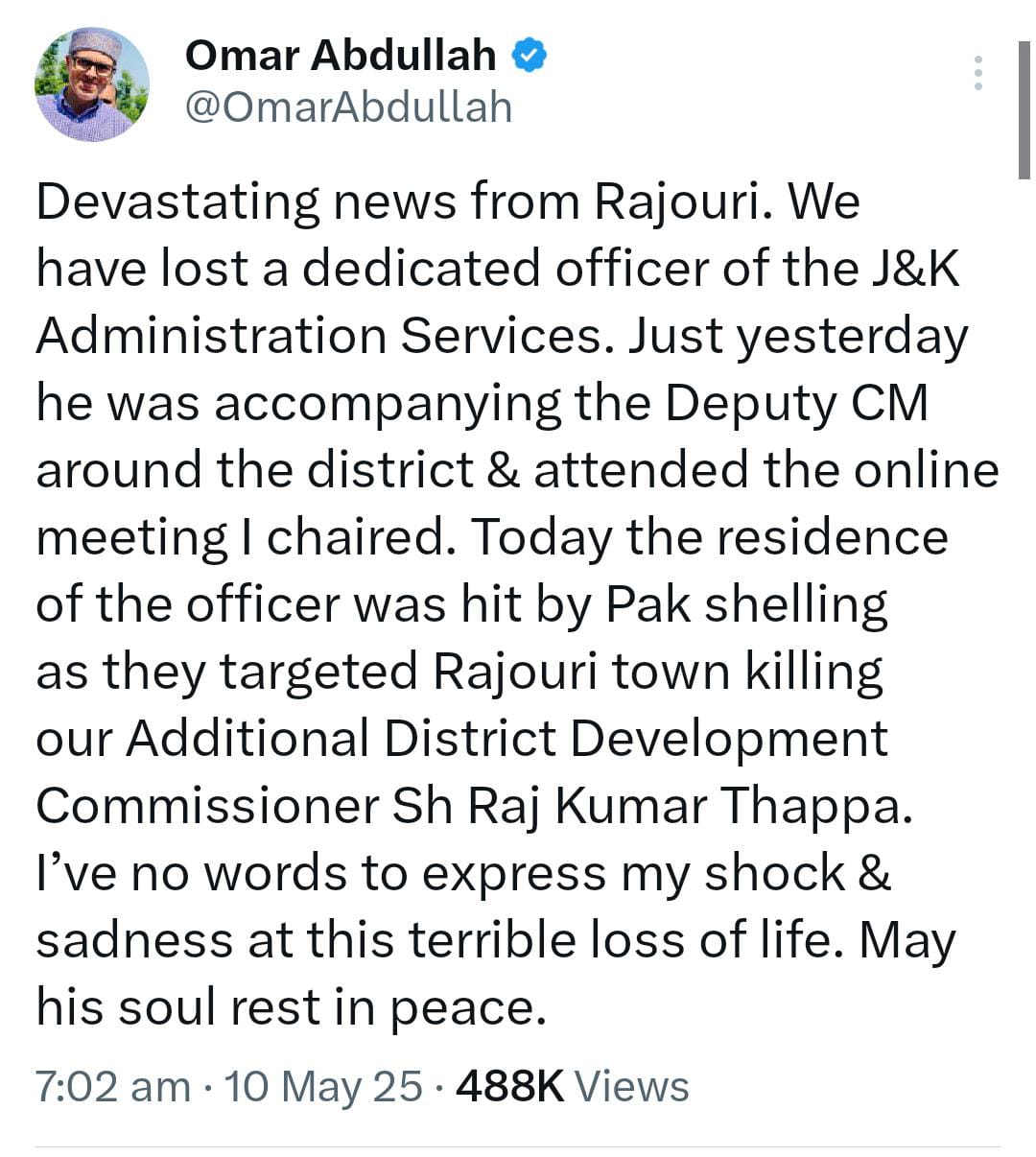 അർദ്ധരാത്രിയിൽ നടന്ന ഷെല്ലാക്രമണം ജമ്മുകശ്മീര് മുഖ്യമന്ത്രി ഒമര് അബ്ദുല്ല സ്ഥിരീകരിച്ചു