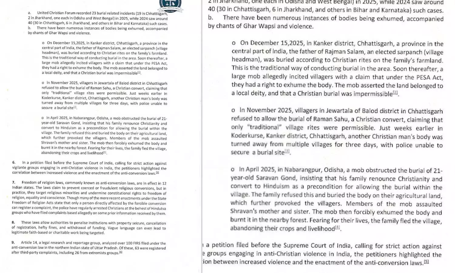 മൃതദേഹം സംസ്കരിക്കുന്നതുമായി ബന്ധപ്പെട്ട് 40 സംഭവങ്ങാണ് ഈ വർഷമുണ്ടായത്. ഇതിൽ 30 എണ്ണവും ഛത്തീസ്ഗഢിലാണ്. സംസ്കാരചടങ്ങുമായി ബന്ധപ്പെട്ടുണ്ടായത് 23 സംഭവങ്ങളാണെന്നും കത്തിൽ പറയുന്നു. ഒഡീഷയിലെ നബരംഗ്പൂരിൽ കഴിഞ്ഞ ഏപ്രിൽ മാസത്തിൽ മൃതദേഹം കുഴിതോണ്ടിയെടുത്ത് കത്തിച്ചിരുന്നു.