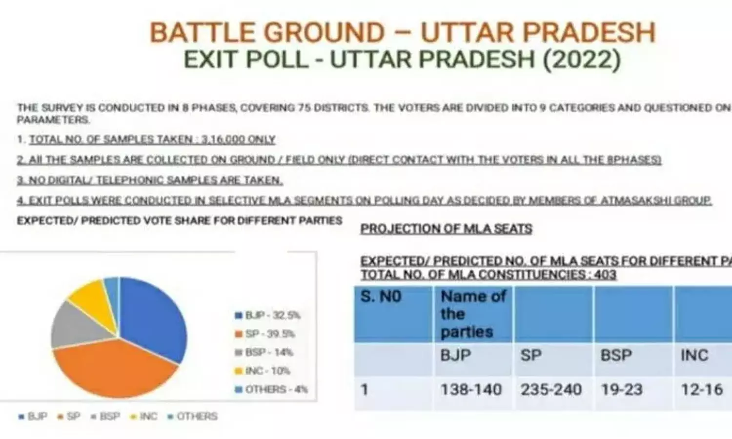 ഫീൽഡ് സർവേ പ്രകാരം ലഭിച്ച സാമ്പിളുകൾ അടിസ്ഥാനമാക്കിയാണ് സർവ്വേ ഫലം പുറത്ത് വിട്ടിരിക്കുന്നതെന്നാണ് ആത്മസാക്ഷി ഗ്രൂപ്പ് വ്യക്തമാക്കിയിരിക്കുന്നത്. 316,000 സാമ്പിളുകളാണ് ശേഖരിച്ചതെന്ന് ഗ്രൂപ്പ് അറിയിച്ചു.