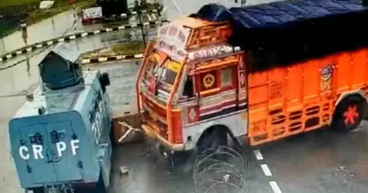 Summary- A speeding truck skidded and hit CRPF vehicle parked across the road, in Pulwama district of Jammu and Kashmir yesterday.