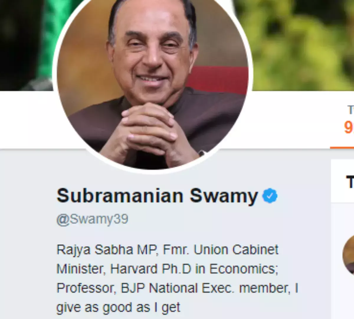 'രാജ്യസഭാ എംപി, മുൻ കേന്ദ്രമന്ത്രി, ഹാവാർഡ് യൂണിവേഴ്സിറ്റി പിഎച്ച്ഡി ബിരുദധാരി, പ്രൊഫസർ, എനിക്ക് കിട്ടിയതു പോലെ നൽകുന്നു'- എന്നാണ് ഇപ്പോൾ സ്വാമിയുടെ വ്യക്തിഗത വിവരങ്ങളിലുള്ളത്. പ്രധാനമന്ത്രി നരേന്ദ്രമോദിയുടെ സാമ്പത്തിക നയങ്ങളുടെ വലിയ വിമർശകനാണ് സുബ്രഹ്മണ്യൻ സ്വാമി.