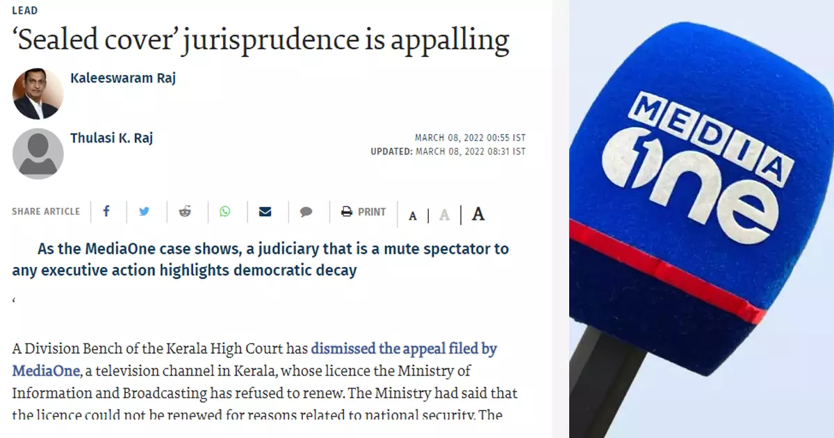 'സീല്ഡ് കവര് വ്യവഹാരം ഭയാനകം': മീഡിയവണ് വിലക്ക് പരാമര്ശിച്ച് ദ ഹിന്ദുവില് ലേഖനം
