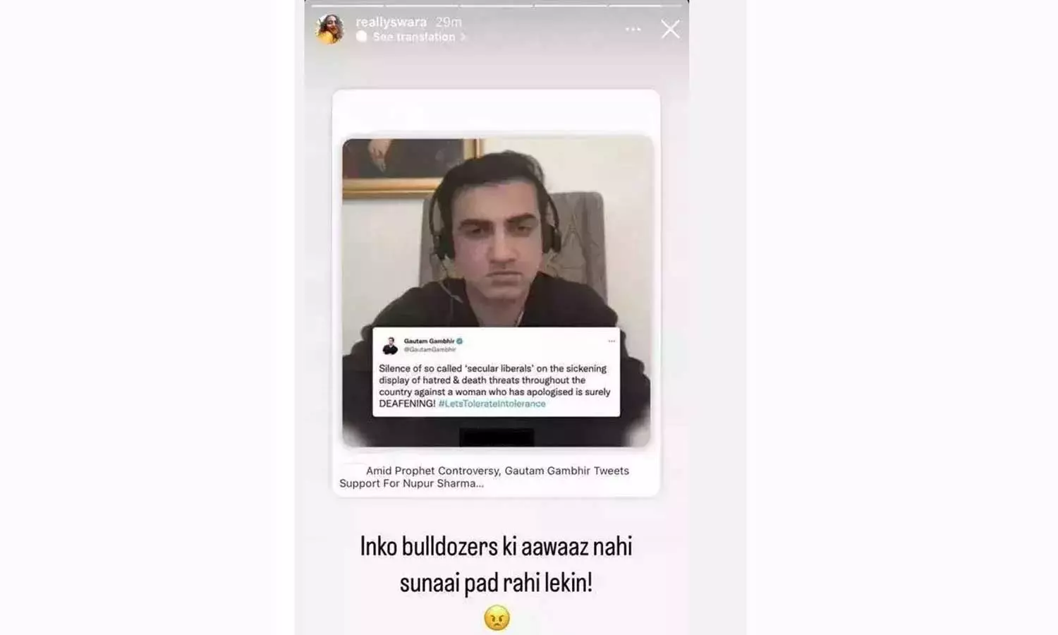 'ബുൾഡോസറിന്റെ ശബ്ദം അയാൾ കേൾക്കുന്നേയില്ല'; നുപൂര് ശര്മയെ ന്യായീകരിച്ച ഗംഭീറിന് സ്വര ഭാസ്ക്കറിന്റെ മറുപടി