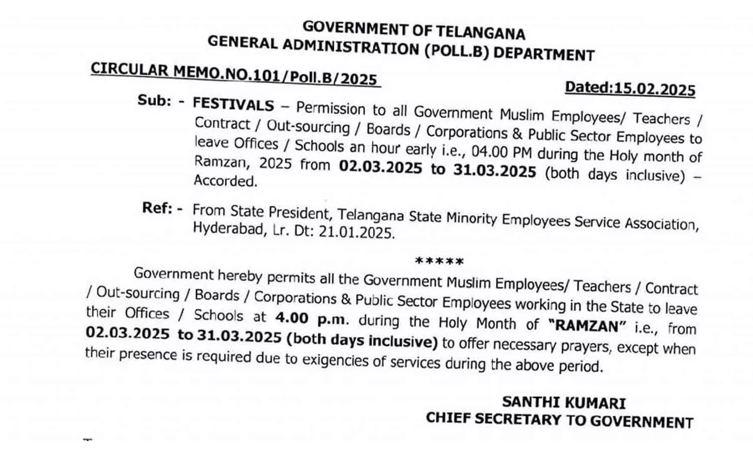 റമദാനിൽ മുസ്ലിം ജീവനക്കാർക്ക് ജോലി സമയത്തിൽ ഇളവ് അനുവദിച്ച് തെലങ്കാന സർക്കാർ
