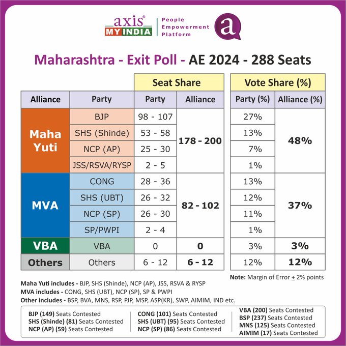 ആക്സിസ് മൈ ഇന്ത്യ എക്സിറ്റ് പോൾ പ്രകാരം മഹായുതി സഖ്യം 178 മുതൽ 200 സീറ്റുകൾ വരെ നേടുമെന്നാണ് പ്രവചനം. ഉദ്ധവ് താക്കറെ വിഭാഗം ശിവസേന, കോൺഗ്രസ്, ശരത് പവാറിെൻറ എൻസിപി എന്നിവരടങ്ങിയ മഹാവികാസ് അഘാഡി സഖ്യം 82 മുതൽ 102 സീറ്റുകളിലായി ഒതുങ്ങും. 48 ശതമാനം വോട്ടും ഭരണ മുന്നണി നേടുമെന്നും പ്രതിപക്ഷത്തിന് 37 ശതമാനം മാത്രമേ ലഭിക്കൂവെന്നും എക്സിറ്റ് പോളിൽ പറയുന്നു.