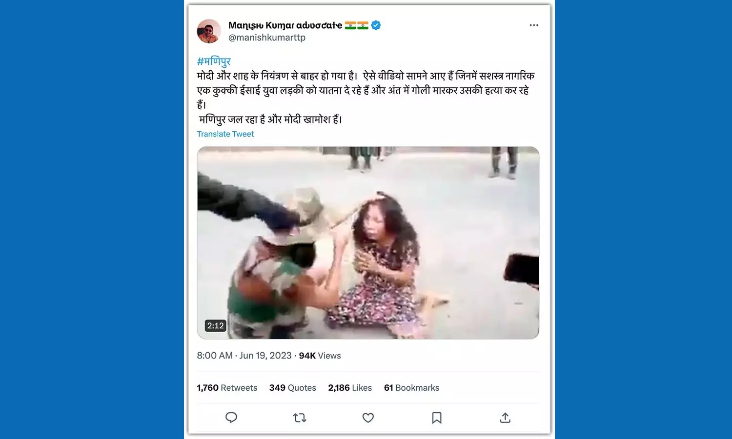 |കുകി വിഭാഗത്തിൽപ്പെട്ട ക്രിസ്ത്യൻ പെൺകുട്ടിയെ വെടിവച്ചു കൊല്ലുന്നു എന്ന തലക്കെട്ടോടെയാണ് ചിത്രങ്ങളും വീഡിയോയും പ്രചരിക്കുന്നത്.