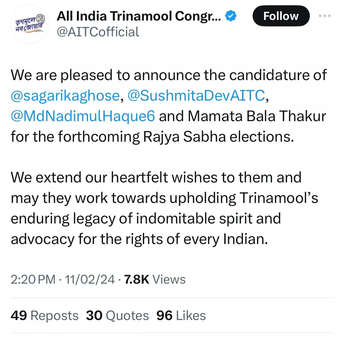 Summary: Trinamul Congress names journalist Sagarika Ghose, Sushmita Dev and two others for Rajya Sabha polls