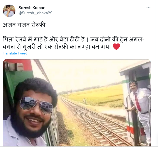 റെയില്വെയില് ജോലി ചെയ്യുന്ന അച്ഛനും മകനും ട്രയിനുകള് ക്രോസ് ചെയ്യുന്നതിനിടെയാണ് കണ്ടുമുട്ടിയത്. മകന് ടിടിഇയും പിതാവ് റെയില്വെ ഗാര്ഡുമാണ്. ഡ്യൂട്ടിക്കിടെയാണ് ഇരുവരും രണ്ടു ട്രയിനുകളിലായി കണ്ടത്. അപ്പോള് തന്നെ ആ നിമിഷം മകന് സെല്ഫി രൂപത്തില് പകര്ത്തുകയും ചെയ്തു. സുരേഷ് കുമാര് എന്ന ട്വിറ്റര് അക്കൗണ്ടില് നിന്നാണ് ഈ ചിത്രം പുറത്തുവിട്ടിരിക്കുന്നത്. 'അതിശയകരമായ സെൽഫി. അച്ഛൻ റെയിൽവേയിൽ ഗാർഡാണ്, മകൻ ടിടിഇയാണ്. രണ്ട് ട്രെയിനുകൾ അരികിലൂടെ കടന്നുപോയപ്പോൾ അത് ഒരു സെൽഫി നിമിഷത്തിലേക്ക് നയിച്ചു'എന്ന അടിക്കുറിപ്പോടെയാണ് ചിത്രം പങ്കുവച്ചിരിക്കുന്നത്.