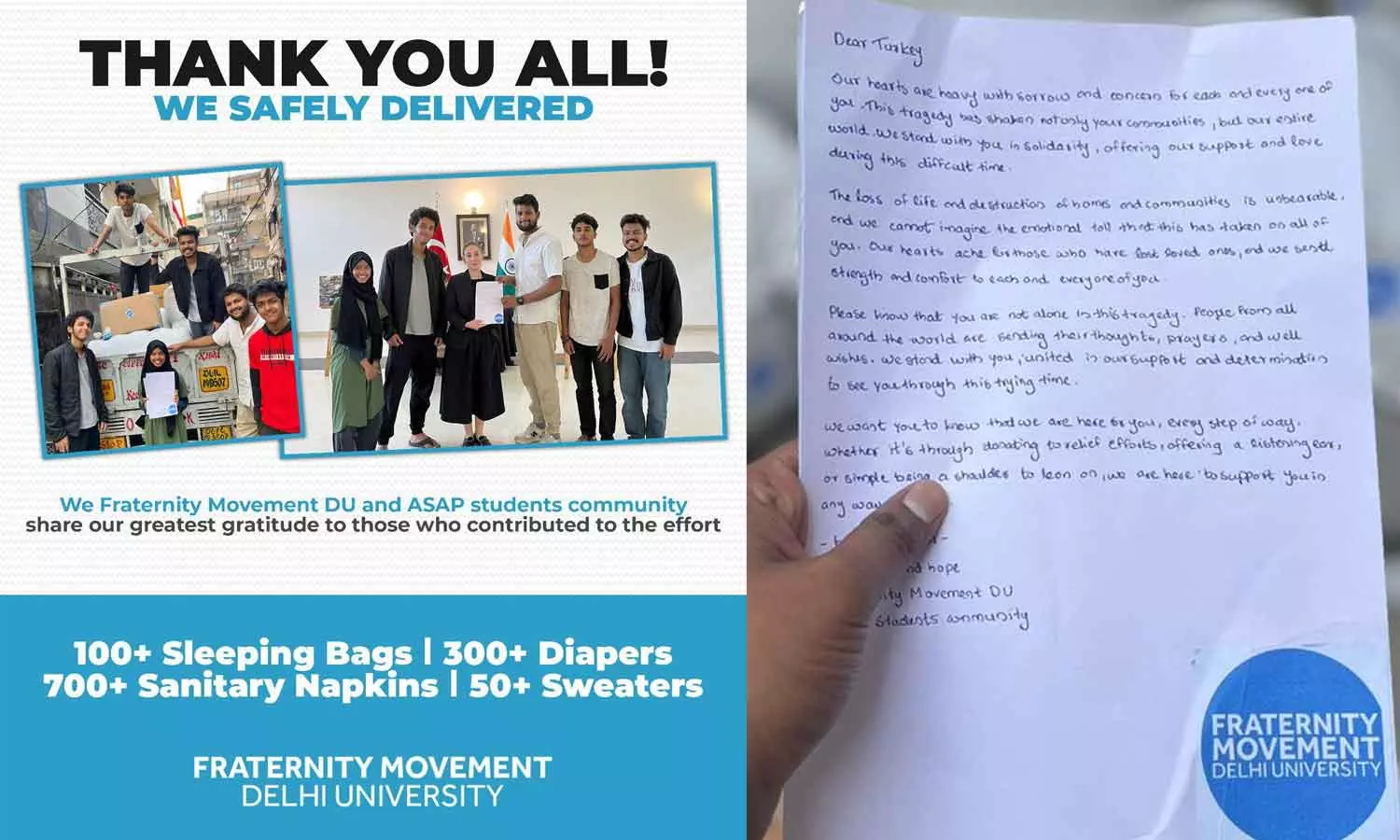 ന്യൂഡൽഹി: ഫ്രറ്റേണിറ്റി മൂവ്മെന്റ് ഡൽഹി യൂണിവേഴ്സിറ്റി യൂണിറ്റും അസാപ് സ്റ്റുഡന്റസ് കമ്മ്യൂണിറ്റിയും സംയുക്തമായി തുർക്കി - സിറിയ ഭൂകമ്പ ബാധിതർക്ക് ശേഖരിച്ച വിവിധ വസ്തുക്കൾ തുർക്കി എംബസി അറ്റാഷേക്ക് യൂണിറ്റ് ഭാരവാഹികൾ കൈമാറി. ഫ്രറ്റേണിറ്റി മൂവ്മെന്റ് ഡൽഹി യൂണിവേഴ്സിറ്റി പ്രസിഡന്റ് ഫയ്യാസ് അഷ്റഫ്, അസാപ് കൺവീനർ നവാർ ഇലഫ്, യൂണിറ്റ് എക്സിക്യൂട്ടീവ് അംഗങ്ങളായ അമീൻ അഹ്സൻ, ഫിദ ബിലാൽ, ജസീം എന്നിവർ ചേർന്ന് കൈമാറി. സ്ലീപ്പിങ് ബാഗുകൾ, സൈ്വറ്ററുകൾ, സാനിറ്ററി പാഡുകൾ, കുട്ടികൾക്കുള്ള ഡൈപ്പറുകൾ എന്നിവയാണ് കൈമാറിയത്.