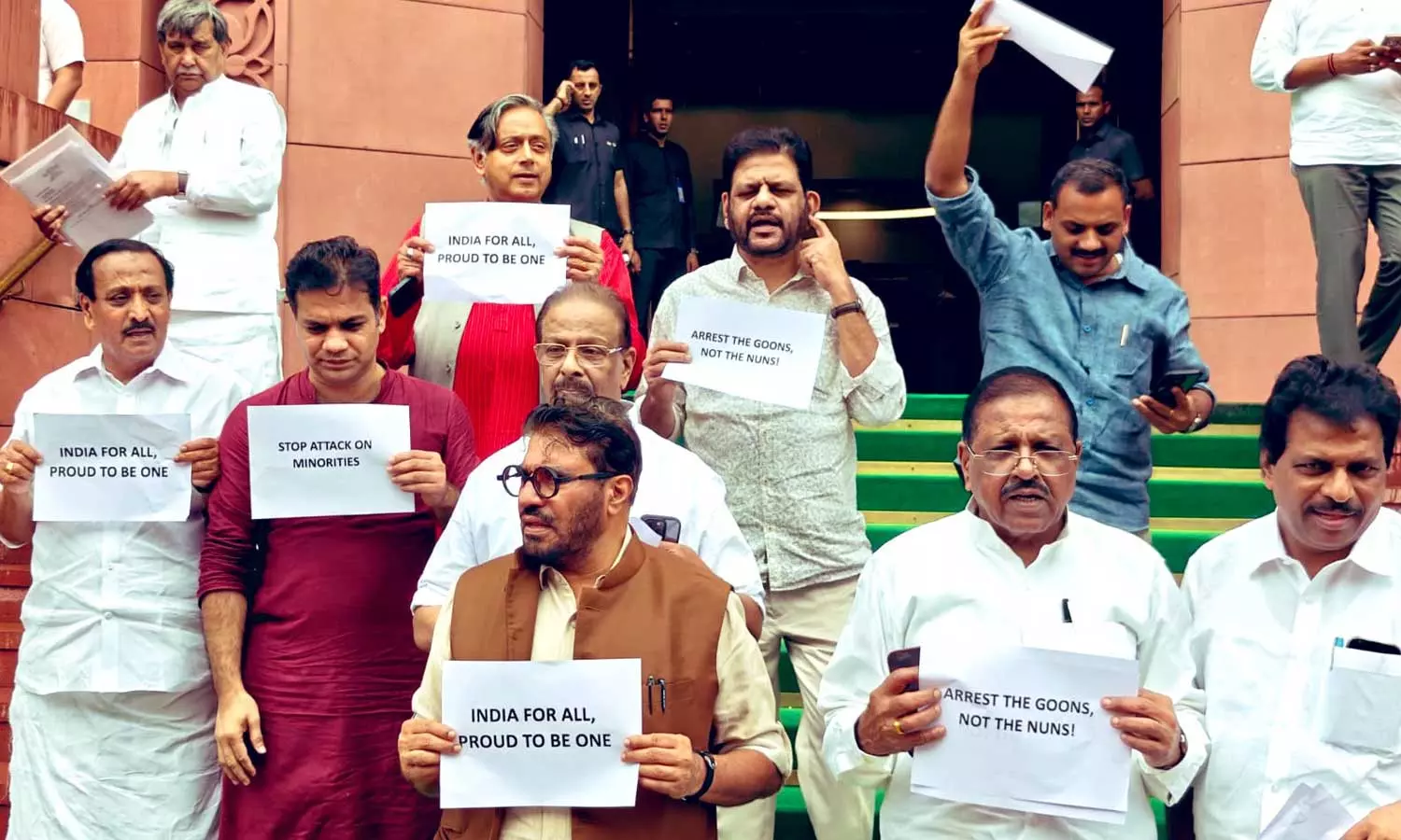 'കന്യാസ്ത്രീകളെയല്ല, അവരെ ആക്രമിച്ച ഗുണ്ടകളെയാണ് സർക്കാർ അറസ്റ്റ് ചെയ്യേണ്ടത്'; പാർലമെന്റിന് പുറത്ത് യുഡിഎഫ് എംപിമാരുടെ പ്രതിഷേധം