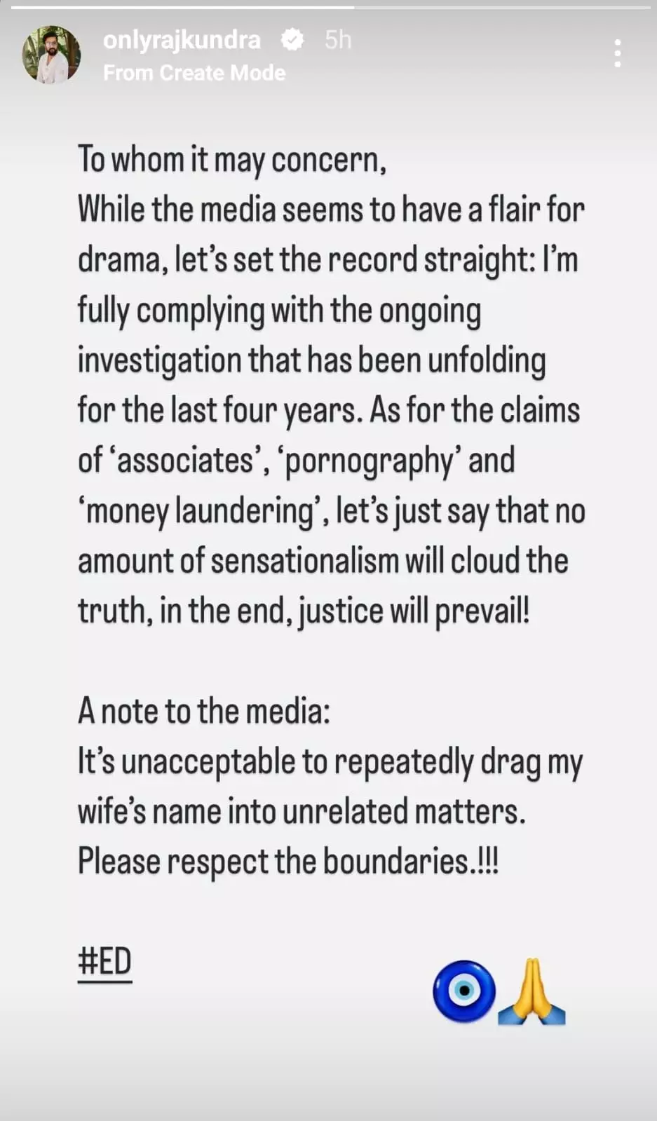 അന്വേഷണ ഏജൻസികളുമായി സഹകരിക്കുന്നുണ്ടെന്ന് കുന്ദ്ര വ്യക്തമാക്കി. ഭാര്യ ശിൽപ ഷെട്ടിയുടെ പേര് കേസിലേക്ക് വലിച്ചിഴക്കുന്നതിനെതിരെയും അദ്ദേഹം മാധ്യമങ്ങൾക്ക് മുന്നറിയിപ്പ് നൽകി. ''കഴിഞ്ഞ നാല് വർഷമായി നടന്നുകൊണ്ടിരിക്കുന്ന അന്വേഷണത്തോട് ഞാൻ പൂർണമായും യോജിക്കുന്നു.അശ്ലീലച്ചിത്ര നിര്മാണം, കള്ളപ്പണം വെളുപ്പിക്കല് തുടങ്ങിയവയുടെ അവകാശവാദങ്ങളെ സംബന്ധിച്ചിടത്തോളം, ഒരു സെൻസേഷണലിസവും സത്യത്തെ മറയ്ക്കില്ല, അവസാനം നീതി വിജയിക്കും'' അദ്ദേഹം കുറിച്ചു. ഒരു ബന്ധവുമില്ലാത്ത കാര്യങ്ങളിലേക്ക് തന്റെ ഭാര്യയുടെ പേര് ആവര്ത്തിച്ച് വലിച്ചിഴക്കുന്നത് അംഗീകരിക്കാനാവില്ലെന്നും അതിര് കടക്കരുതെന്നും പോസ്റ്റില് പറയുന്നു.