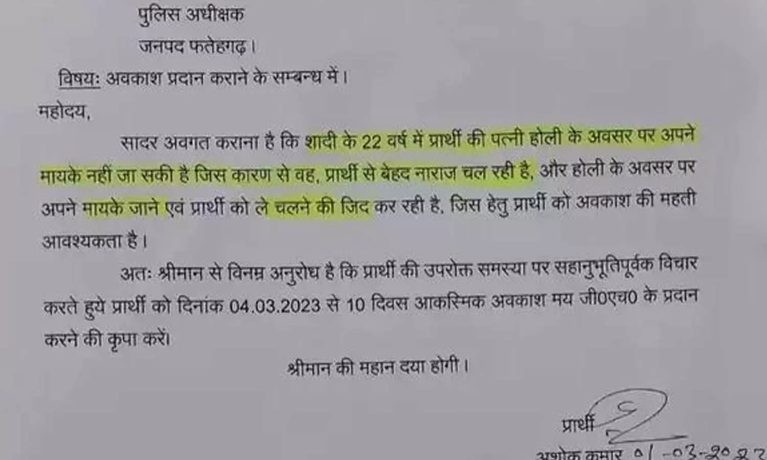 ഉത്തർപ്രദേശിലെ ഫറൂഖാബാദ് ജില്ലയിലെ ഇൻസ്പെക്ടറായ അശോക് കുമാറാണ് ഹോളി ആഘോഷത്തിന് വേണ്ടി 10 ദിവസത്തെ അവധിക്ക് അപേക്ഷിച്ചത്. വിവാഹം കഴിഞ്ഞനാൾ തൊട്ട് സ്വന്തം വീട്ടിൽ ഹോളി ആഘോഷിക്കാൻ കഴിയാത്ത വിഷമത്തിലാണ് ഭാര്യയെന്നും ഇത്തവണയെങ്കിലും ആ ആഗ്രഹം സാധിപ്പിച്ചുകൊടുക്കണമെന്നും പൊലീസുകാരൻ പറയുന്നു.