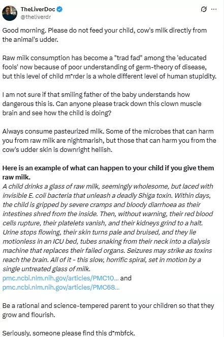 "ഇത് കുഞ്ഞിന് നല്ലതാണോ? ദയവായി ഉത്തരം പറയൂ." എന്ന അടിക്കുറിപ്പോടെ @DonaldTunp75739 എന്ന എക്സ് അക്കൌണ്ടിൽ നിന്നാണ് വീഡിയോ അപ്ലോഡ് ചെയ്തിരിക്കുന്നത്. ഒരാൾ ചിരിച്ചുകൊണ്ട് തന്റെ കുഞ്ഞിന് പശുവിന്റെ അകിടിൽ നിന്നും നേരിട്ട് പാൽ കൊടുക്കുന്നതാണ് വീഡിയോയിൽ ഉള്ളത്. നിരവധി പേരാണ് ഇതിനെതിരെ രംഗത്തെത്തിയത്. അശാസ്ത്രീയമായ ചികിത്സാരീതികൾക്കതിരെ തുറന്നടിക്കാറുള്ള മലയാളി ഡോക്ടര് സിറിയക് ആബി ഫിലിപ്സ് വീഡിയേ പങ്കുവയ്ക്കുകയും ഇങ്ങനെ പാൽ കൊടുക്കുന്നത് മൂലമുള്ള ഗുരുതരമായ ആരോഗ്യ പ്രശ്നങ്ങൾ ചൂണ്ടിക്കാണിക്കുകയും ചെയ്തു. ഇത്തരത്തിൽ തിളപ്പിക്കാത്ത പാൽ അകത്തുചെന്നാൽ കുഞ്ഞുങ്ങൾക്ക് വയറിളക്കമുണ്ടാകുമെന്ന് അദ്ദേഹം പറയുന്നു. ചുവന്ന രക്താണുക്കളുടെ നാശം, പ്ലേറ്റ്ലെറ്റുകളുടെ കുറവ്, പൂർണമായ വൃക്ക തകരാറ് എന്നിവയിലേക്കും നയിച്ചേക്കാം. ''വിദ്യാസമ്പന്നരായ വിഡ്ഢികൾക്കിടയിൽ അസംസ്കൃത പാൽ ഉപഭോഗം ഒരു ഭ്രമമായി മാറിയിരിക്കുന്നു'' ഡോക്ടര് വിമര്ശിച്ചു.