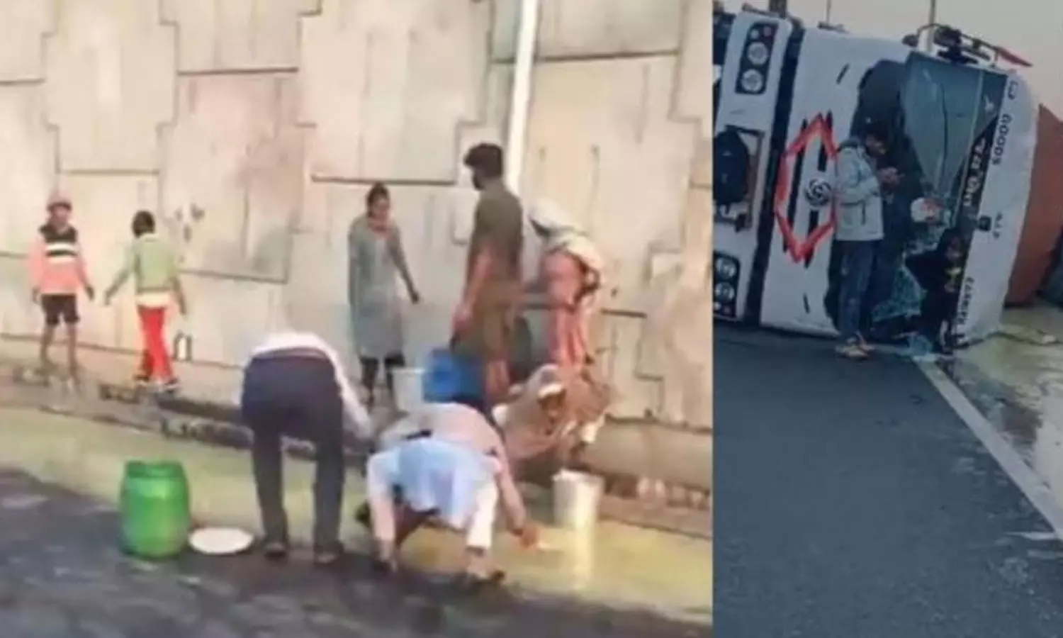 42,000 ലിറ്റർ എണ്ണയുമായി കണ്ടെയ്നർ മറിഞ്ഞു; ബക്കറ്റുമായി പാഞ്ഞെത്തി നാട്ടുകാർ, വീഡിയോ