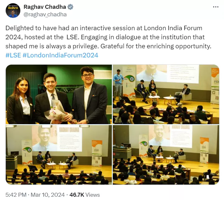 എന്നാല് അദ്ദേഹത്തിന്റെ എക്സ് അക്കൗണ്ടില് പറയുന്നത് പ്രകാരം മാര്ച്ച് 8 മുതല് ഛദ്ദ ലണ്ടനിലാണ്. മാർച്ച് 9 ന് ലണ്ടൻ സ്കൂൾ ഓഫ് ഇക്കണോമിക്സ് സംഘടിപ്പിച്ച ലണ്ടൻ ഇന്ത്യ ഫോറം 2024-ൽ ഒരു ഇൻ്ററാക്ടീവ് സെഷനിൽ പങ്കെടുക്കാനാണ് അദ്ദേഹം ലണ്ടനിലേക്ക് പോയത്. അദ്ദേഹത്തിൻ്റെ ഭാര്യയും ബോളിവുഡ് നടിയുമായ പരിനീതി ചോപ്രയും ഫോറത്തില് സംസാരിക്കുന്നുണ്ട്. ഈ സന്ദർശന വേളയിൽ അദ്ദേഹം വിവാദ യുകെ പാർലമെൻ്റംഗം പ്രീത് കൗർ ഗില്ലുമായി കൂടിക്കാഴ്ച നടത്തിയതും ബി.ജെ.പിയുടെ വിമർശനത്തിന് ഇടയാക്കിയിരുന്നു. യു.കെ എം.പി ഖലിസ്ഥാനികൾക്കായി ഫണ്ട് സമാഹരിക്കുകയും ഇന്ത്യാ ഹൗസിന് പുറത്ത് അക്രമാസക്തമായ പ്രതിഷേധങ്ങൾക്ക് ധനസഹായം നൽകുകയും ചെയ്തുവെന്ന് ഗില്ലുമായുള്ള കൂടിക്കാഴ്ചയെ ചോദ്യം ചെയ്ത ബി.ജെ.പി ഐ.ടി സെൽ മേധാവി അമിത് മാളവ്യ ആരോപിച്ചു.