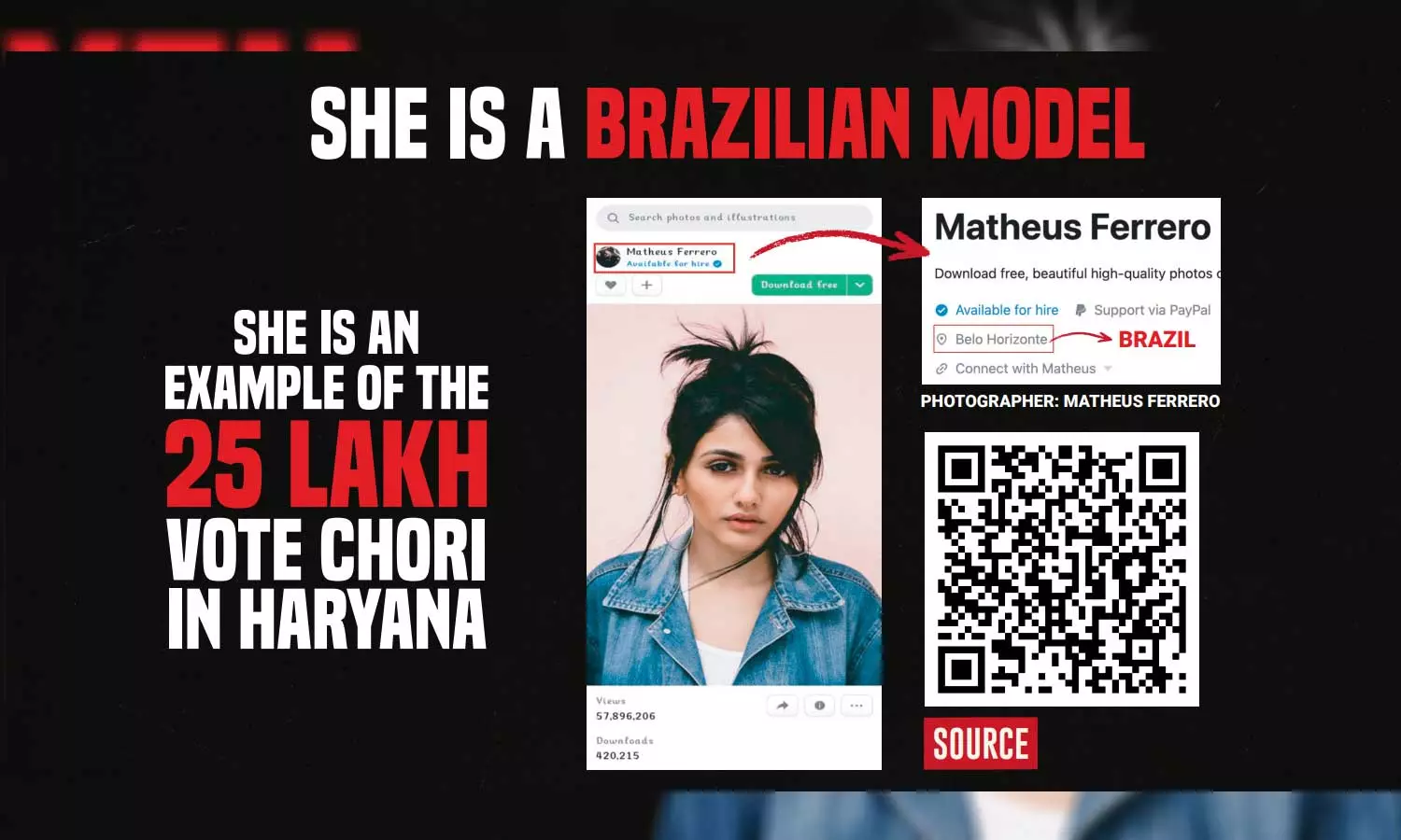 രാഹുലിന്റെ പ്രസന്റേഷനിൽ കാണിച്ച ബ്രസീലിയൻ മോഡലിന്റെ ചിത്രം ഫോട്ടോഗ്രാഫർ മാത്യൂസ് ഫെറേറോ സൗജന്യ സ്റ്റോക്ക് ഇമേജ് പ്ലാറ്റ്ഫോമായ Unsplash.com-ല് അപ്ലോഡ് ചെയ്തിട്ടുള്ളത്. 'നീല ഡെനിം ജാക്കറ്റ് ധരിച്ച സ്ത്രീ' എന്ന തലക്കെട്ടിലുള്ള ചിത്രം ആദ്യമായിപ്രസിദ്ധീകരിച്ചത് 2017 മാർച്ച് 2 നാണ്. 59 ദശലക്ഷത്തിലധികം പേര് ഈ ചിത്രം ഇത് കാണുകയും നാല് ലക്ഷത്തിലധികം തവണ ഡൗൺലോഡ് ചെയ്യുകയും ചെയ്തിട്ടുണ്ട്.പ്രൊഫഷണൽ ഫോട്ടോഗ്രാഫറാണ് ഫെറേറോ എന്നാണ് അൺസ്പ്ലാഷിലെ പ്രൊഫൈലില് നിന്നും മനസിലാക്കാന് കഴിയുുന്നത്.ഹരിയാന തെരഞ്ഞെടുപ്പുമായി ബന്ധമില്ലാത്ത ബ്ലോഗുകളിലും ഓൺലൈൻ പോസ്റ്റുകളിലും ഈ ചിത്രം വ്യാപകമായി ഉപയോഗിച്ചിട്ടുണ്ട്. അതേസമയം, രാഹുല് ഗാന്ധി ആരോപിച്ച വോട്ടര് തട്ടിപ്പില് മോഡലിന്റെയോ ഫോട്ടോഗ്രാഫറുടെയും പങ്ക് എന്താണെന്ന് വ്യക്തമല്ല.