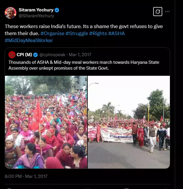 ന്യൂഡൽഹി: 2017ൽ ഹരിയാനയിൽ ആശാ പ്രവർത്തകരും ഉച്ചഭക്ഷണ തൊഴിലാളികളും നടത്തിയ സമരത്തെ പിന്തുണച്ചുകൊണ്ടുള്ള സിപിഎം മുൻ ജനറൽ സെക്രട്ടറി സീതാറാം യെച്ചൂരിയുടെ പോസ്റ്റ് ചർച്ചയാകുന്നു. സർക്കാർ വാഗ്ദാനങ്ങൾ പാലിക്കുന്നില്ലെന്ന് കാണിച്ച് 2017 ഫെബ്രുവരി 28ന് ആയിരക്കണക്കിന് ആശാ പ്രവർത്തകരും ഉച്ചഭക്ഷണ തൊഴിലാളികളും ഹരിയാന നിയമസഭയിലേക്ക് മാർച്ച് നടത്തിയിരുന്നു.