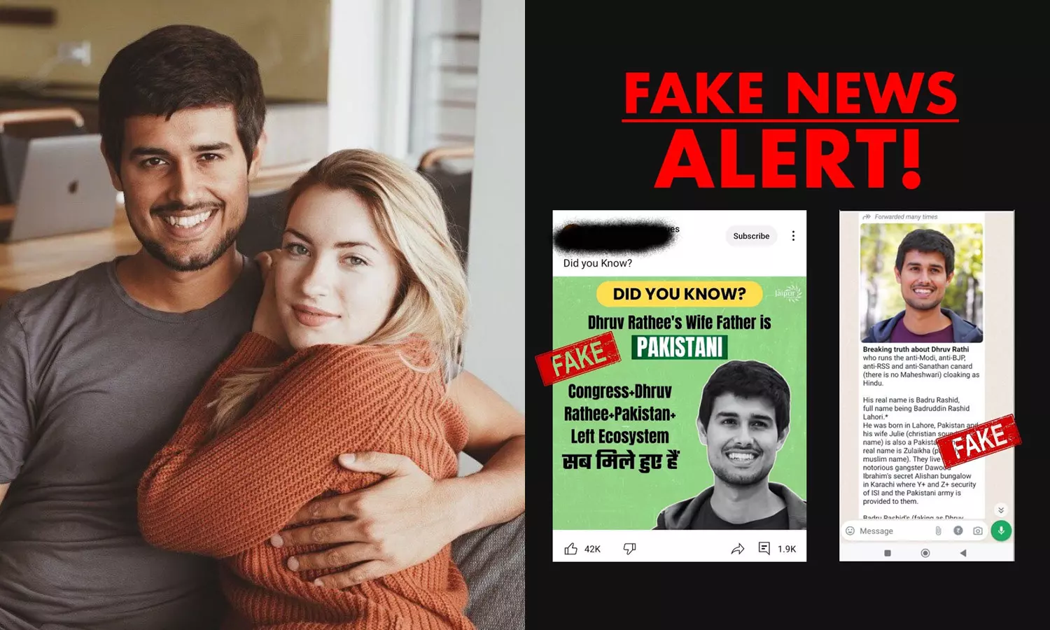 'ധ്രുവ് റാഠിയുടെ ഭാര്യാപിതാവ് പാകിസ്താനി. കോൺഗ്രസ്- ധ്രുവ് റാഠി- പാകിസ്താൻ ലെഫ്റ്റ് ഇക്കോസിസ്റ്റം- സബ് മിലേ ഹുയേ ഹേ (എല്ലാം ഒരുമിച്ചാണ്)' എന്നാണ് മറ്റൊരു വ്യാജ പ്രചരണ പോസ്റ്ററിലെ വാചകങ്ങൾ. പിന്നാലെ, വ്യാജപ്രചാരകർക്ക് മറുപടിയുമായി ധ്രുവ് റാഠി രംഗത്തെത്തി.