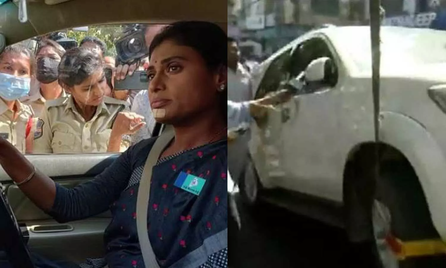 മുഖ്യമന്ത്രിയുടെ വസതിക്ക് മുന്നിൽ പ്രതിഷേധം; ശർമിള റെഡ്ഡിയെ കാറിലിരുത്തി ക്രെയിനുപയോഗിച്ച് വലിച്ചുമാറ്റി പൊലീസ്