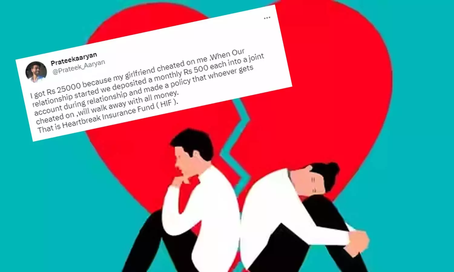 'എന്റെ കാമുകി എന്നെ ചതിച്ചതിനാൽ എനിക്ക് 25000 രൂപ ലഭിച്ചു. ഞങ്ങളുടെ ബന്ധം ആരംഭിച്ചപ്പോൾ ഞങ്ങൾ പ്രതിമാസം 500 രൂപ വീതം ജോയിന്റ് അക്കൗണ്ടിൽ നിക്ഷേപിക്കുകയും ആരു ചതിച്ചാലും മുഴുവൻ പണവും നൽകുകയും ചെയ്യും എന്ന പോളിസി ഉണ്ടാക്കിയിരുന്നു. അതാണ് ഹാർട്ട് ബ്രേക്ക് ഇൻഷുറൻസ് ഫണ്ട്'. പ്രതീക് ആര്യൻ ട്വീറ്റ് ചെയ്തു.