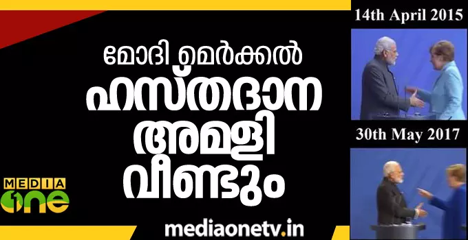 |മോദിയുടെ ആദ്യത്തെ ജര്മ്മനി സന്ദര്ശനത്തിനിടെയായിരുന്നു ആഞ്ചല മെര്ക്കലുമായുള്ള ഹസ്തദാനം വാര്ത്തകളില് ഇടംപിടിച്ചത്. രണ്ട് വര്ഷത്തിനിപ്പുറം അതേ രാഷ്ട്ര നേതാക്കള്ക്കിടയില് ഹസ്തദാന അമളി ആവര്ത്തിച്ചു.