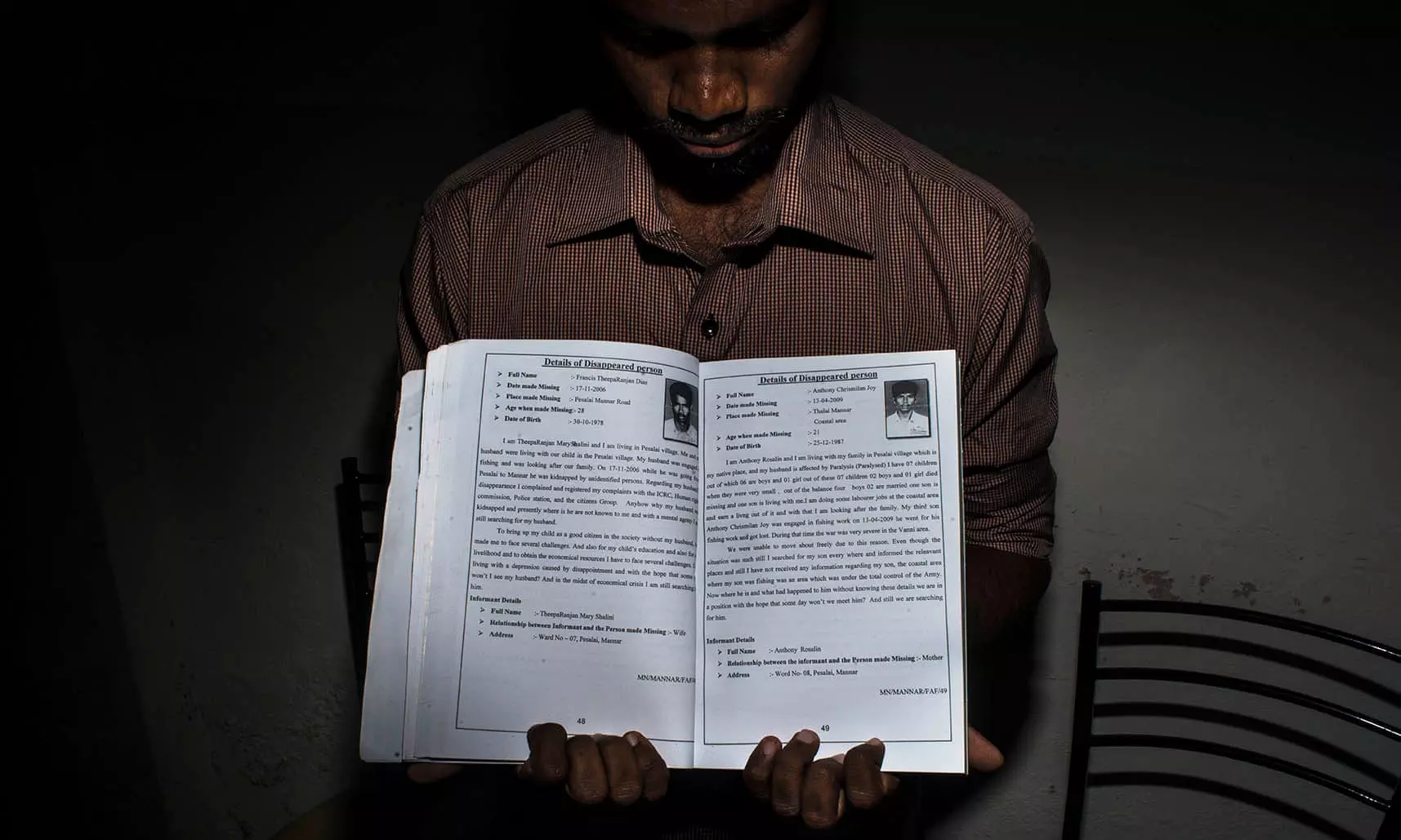 മാന്നാര് ജില്ലയില് നിന്ന് കാണാതായവരുടെ ചിത്രങ്ങളും ഫയലുകളും. 65,000 പേരെ കാണാതായതായി വിദേശകാര്യ മന്ത്രാലയം സമ്മതിക്കുന്നുണ്ട്. എന്നാല് അനൗദ്യോഗിക കണക്കുകള് പ്രകാരം ഒരു ലക്ഷത്തോളം വരുന്നവരെ പട്ടാളവും അര്ദ്ധസൈനിക വിഭാഗങ്ങളും തട്ടിക്കൊണ്ടുപോവുകയും അറസ്റ്റുചെയ്യുകയും ചെയ്തിട്ടുണ്ട്.