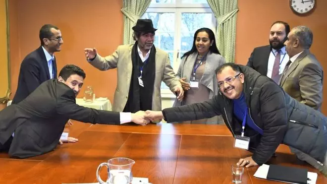 ഹൂദിയുടെയും യമന് സര്ക്കാരിന്റെയും പ്രതിനിധികള് തമ്മില് ഹസ്തദാനം ചെയ്യുന്നുഹുദൈദയില് വെടിനിര്ത്തല് പ്രഖ്യാപിച്ച് ആദ്യ ഘട്ട സമാധാന ചര്ച്ച പൂര്ത്തിയായി