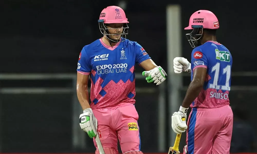 ലക്ഷ്യത്തിലേക്ക് ബാറ്റു വീശിയ രാജസ്ഥാൻ തകർച്ചയോടെയാണ് തുടങ്ങിയത്. നാലാം ഓവറിലെ രണ്ടാം പന്തിൽ തന്നെ ഓപണർ ജോസ് ബട്ലർ (5) പുറത്തായി. സ്കോർ ബോർഡിൽ 21 റൺസ് മാത്രം. എന്നാൽ വൺഡൗൺ ആയെത്തിയ സഞ്ജുവും ജെയ്സ്വാളും പതുക്കെ ഇന്നിങ്സ് മുമ്പോട്ടു കൊണ്ടു പോയി. അഞ്ചാം ഓവറിൽ സ്വന്തം സ്കോർ 22ൽ നിൽക്കെ ജെയ്സ്വാൾ വീണു. പിന്നെ ശിവം ദുബെയുമായി (22) ചേർന്ന് സഞ്ജുവിന്റെ രക്ഷാപ്രവർത്തനം. ദുബെയ്ക്ക് പകരമെത്തിയ തെവാത്തിയ അഞ്ചു റൺെസെടുത്ത് പുറത്തായി.