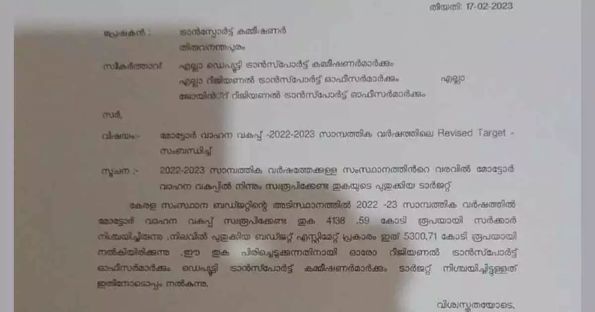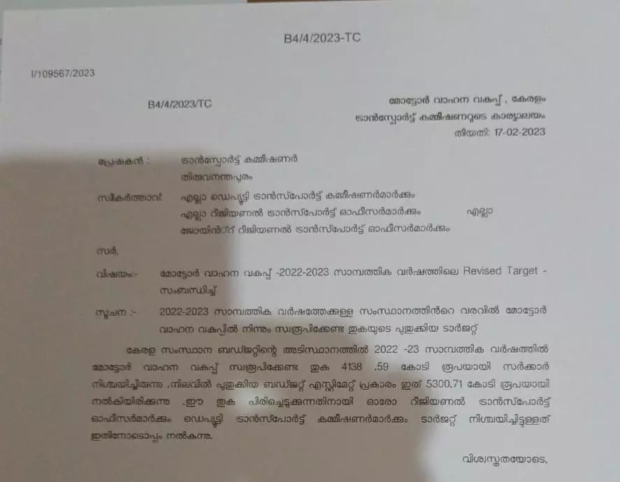 1000 കോടി അധികമായി പിരിക്കാന് നിർദേശം നൽകിയത് ട്രാൻസ്പോർട്ട് കമ്മീഷണര്: വ്യാജമല്ല, ഇതാ രേഖ
