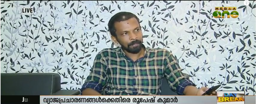 കശ്മീരിലെ ജനങ്ങളോട് ഐക്യദാര്ഢ്യം പ്രഖ്യാപിച്ച് കണ്ണൂരില് കഴിഞ്ഞ ദിവസം നടന്ന ഒരു പരിപാടിയില് രൂപേഷ് പങ്കെടുത്തിരുന്നു. ഇതിനു പിന്നാലെയാണ് വ്യാജപ്രചരണവുമായി ചിലര് രംഗത്തെത്തിയത്. സോഷ്യല് മീഡിയ വഴി ഇത് വ്യാപകമായി പ്രചരിക്കുന്നത് ശ്രദ്ധയില്പെട്ടതിനെ തുടര്ന്ന് രൂപേഷ് തന്നെ ഫേസ്ബുക്കില് മറുപടിയെഴുതി.
