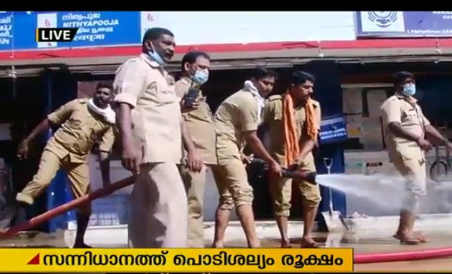 ശ്വാസ തടസ്സവും തുമ്മലും പിടിപെട്ട് നിക്കക്കള്ളിയില്ലാതായപ്പോള് പ്രതിവിധിയും നിശ്ചയിക്കപ്പെട്ടു. നിര്മാണ പ്രവര്ത്തനങ്ങള്ക്കായി കൊണ്ടുവന്ന സാമഗ്രികള് എടുത്തു നീക്കുക. അതുകൊണ്ടും തീര്ന്നില്ല ഫയര്ഫോഴ്സ് രംഗത്തെത്തി. പലയിടങ്ങളിലായി വെള്ളം തളിച്ചും ചീറ്റിച്ചും അഗ്നിശമന സേന കളം നിറഞ്ഞു. പ്രശ്നത്തിന് താല്കാലിക പരിഹാരമായെങ്കിലും സന്നിധാനം കഴുകി വൃത്തിയാക്കാനുള്ള കനത്ത മഴക്കുള്ള കാത്തിരിപ്പ് തുടരുകയാണ്.