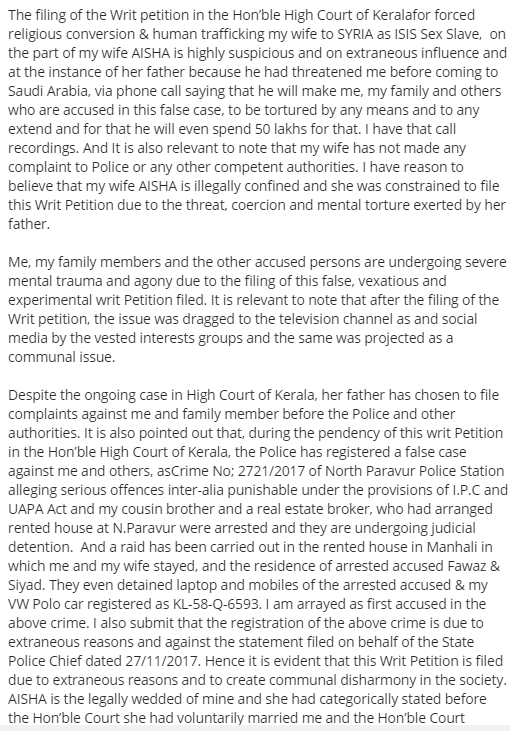 2. അന്യമതസ്ഥരെ വിവാഹം കഴിക്കുന്ന ഹിന്ദുപെണ്കുട്ടികളെ ഹിന്ദുഹെല്പ് ലൈന് വഴിയാണ് ഇവിടേക്ക് എത്തിക്കുന്നത്. ഇതിന്റെ ഓപ്പറേറ്റര് പ്രതീഷ് വിശ്വനാഥന് എന്നയാളാണ്. യോഗ സെന്ററിന്റെ വിവിധ ബ്രാഞ്ചുകളില് രാത്രിയും പകലുമെന്നോളം പെണ്കുട്ടികളെ പീഡിപ്പിക്കുന്നു. യോഗ കേന്ദ്രം ജയില് പോലെയാണ്. ഇവരുടെ ശിക്ഷണത്തിലായില്ലെങ്കില് മയക്കുമരുന്ന് കുത്തിവെക്കുന്നു. ചൂരല് പ്രയോഗം നടത്തുന്നു. നഗ്ന ചിത്രങ്ങളെടുത്ത് ഭീഷണിപ്പെടുത്തുന്നു. സ്ഥാപന നടത്തിപുകാരന് മനോജ് ഗുരുജിയും കോര്ഡിനേറ്റര് ശ്രുതിയും കൗണ്സിലിങ് ക്ലാസുകളില് ഖുര്ആനെയും ബൈബിളിനേയും മോശമാക്കി സംസാരിക്കുന്നു. മുസ്ലിം-കൃസ്ത്യന് വിദ്വേഷമാണ് അവര് പടര്ത്തുന്നത്. മനോജ് ഗുരുജിക്ക് തീവ്രവാദ സംഘടനകളില് നിന്ന് പിന്തുണ ലഭിക്കുന്നുണ്ട്. സര്ക്കാറിലെ ഉന്നതരുമായും ബന്ധമുണ്ട്. ആ പേരുകള് വെളിപ്പെടുത്തിയാല് ജീവന് അപകടത്തിലാവുമെന്ന ഭയമുണ്ട്.