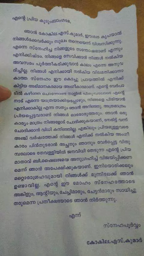 എന്റെ പ്രിയപ്പെട്ട കുടുംബാംഗമേ എന്ന പേരില് തുടങ്ങുന്ന കത്തില് സേവിക്കാന് ജനങ്ങള് നല്കിയ അവസകം പൂര്ത്തിയാക്കാന് കാലം തന്നെ അനുവദിച്ചില്ലെന്ന് പരിഭവമുണ്ട് . നിങ്ങള് എനിക്ക് നല്കിയ അംഗീകാരം പിന്തുടരാനായി പ്രിയ മാതാവിനെ വിജയിപ്പിക്കണമെന്ന് അപേക്ഷിക്കുകയാണെന്നും ഇനിയൊരിക്കലും മറ്റൊരു അപേക്ഷയുമായി ജനങ്ങളിലേക്ക് എത്താന് എനിക്ക് കഴിയില്ലെന്നും കത്ത് പറയുന്നു. സ്നേഹപൂര്വ്വം കോകില എസ് കുമാര് എന്ന പേരോടെയാണ് കത്ത് അവസാനിക്കുന്നത്.