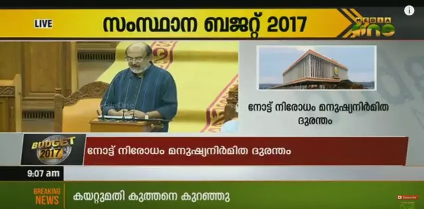 നോട്ട് നിരോധത്തെക്കുറിച്ച് എം ടി വാസുദേവന് നായരുടെ വാക്കുകള് ഉദ്ധരിച്ചാണ് ധനമന്ത്രി ബജറ്റ് അവതരണം തുടങ്ങിയത്. നോട്ട് നിരോധം മനുഷ്യനിര്മിത ദുരന്തമാണ്. സാധാരണക്കാരന്റെ ജീവിതം താറുമാറായി. ബാങ്കുകളില് നിന്ന് വായ്പയെടുക്കാന് ആളില്ലാതായി. കയറ്റുമതി കുത്തനെ കുറഞ്ഞു. നിക്ഷേപത്തിലും ഗണ്യമായ കുറവുണ്ടായി. നോട്ട് നിരോധം സംബന്ധിച്ച് കേന്ദ്രം പറയുന്നത് സാമാന്യ യുക്തിക്ക് നിരക്കാത്തതാണെന്നും ബജറ്റ് അവതരിപ്പിച്ചുകൊണ്ട് മന്ത്രി പറഞ്ഞു.