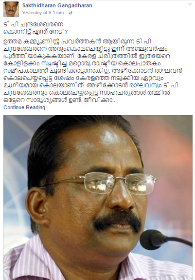 അഴിക്കോടന് രാഘവന് കൊലചെയ്യപ്പെട്ട ശേഷം കേരളത്തെ നടുക്കിയ ഏറ്റവും മൃഗീയമായ കൊലയാണിത്. ജീവിക്കാന് അനുവദിച്ചിരുന്നെങ്കില് അഴിക്കോടന് രാഘവനെപ്പോലെയോ അതിനപ്പുറമോ സംഘടനാപാടവമുള്ള ഒരു നേതാവാകുമായിരുന്നു ടിപി. ഒരു ഗ്രാമത്തിന്റെ ഹൃദയത്തുടിപ്പായിരുന്നു ടിപി എന്ന രണ്ടക്ഷരമെന്നും പറഞ്ഞാണ് ശക്തിധരന് തന്റെ പോസ്റ്റ് ആരംഭിച്ചിരിക്കുന്നത്.