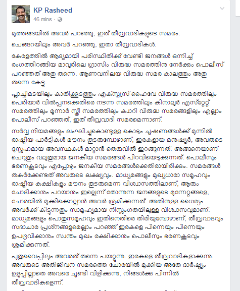 മുത്തങ്ങയില് അവര് പറഞ്ഞു, ഇത് തീവ്രവാദികളുടെ സമരം.ചെങ്ങറയിലും അവര് പറഞ്ഞു, ഇതാ തീവ്രവാദികള്.കേരളത്തില് ആദ്യമായി പരിസ്ഥിതിക്ക് വേണ്ടി ജനങ്ങള് ഒന്നിച്ച് രംഗത്തിറങ്ങിയ മാവൂരിലെ ഗ്രാസിം വിരുദ്ധ സമരത്തിനു നേര്ക്കും പൊലീസ് പറഞ്ഞത് അതു തന്നെ. ആണവനിലയ വിരുദ്ധ സമര കാലത്തും അതു തന്നെ കേട്ടു. പുതുവൈപ്പിലും അവരത് തന്നെ പയറ്റുന്നു. ഇരകളെ തീവ്രവാദികളാക്കുന്നു. അവരുടെ അതിജീവന സമരത്തെ ചോരയില് മുക്കിയ അതേ ദാര്ഷ്ഠ്യം ഉളുപ്പില്ലാതെ അവരെ ചൂണ്ടി വിളിക്കുന്നു, നിങ്ങള്ക്കു പിന്നില് തീവ്രവാദികളെന്ന് - പുതുവൈപ്പിലെ പൊലീസ് നരനായിട്ടിനെയും സമരത്തിലേര്പ്പെട്ട ജനതക്ക് തീവ്രവാദ ബന്ധം ചാര്ത്തി നല്കുന്ന പൊലീസ് നിലപാടിനെയും വിമര്ശിച്ച് മാധ്യമ പ്രവര്ത്തകനായ കെ പി റഷീദിന്റെ ഫേസ്ബുക്ക് പോസ്റ്റിലേതാണ് ഈ വരികള്. ഇത്തരം പൊലീസ്-ഭരണകൂട ഉഡായിപ്പുകള്ക്കുനേരെ കാര്ക്കിച്ചു തുപ്പാന് പൊതുസമൂഹം തയ്യാറാവുന്നതുവരെ ഇതിങ്ങനെ തുടര്ന്നു കൊണ്ടേയിരിക്കുമെന്ന് പോസ്റ്റ് മുന്നറിയിപ്പ് നല്കുന്നു.
