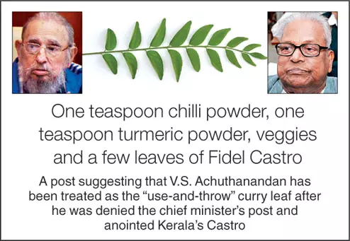 |തെരഞ്ഞെടുപ്പിന് ശേഷം വിഎസിനെ തഴഞ്ഞ സിപിഎം നിലപാടിനെ പരിഹസിക്കുകയാണ് ടെലിഗ്രാഫ്. ഫിദലിന്റെയും വിഎസിന്റെയും ഫോട്ടോക്ക് നടുവില് കറിവേപ്പിലയുടെ പടം. താഴെ ഒരു പാചകക്കുറിപ്പും. പാചകക്കുറിപ്പില് കറിവേപ്പിലക്ക് പകരം ഫിദല് കാസ്ട്രോയുടെ പേര്. സോഷ്യല് മീഡിയയില് പ്രചരിക്കുന്ന പാചകക്കുറിപ്പ് എന്ന രീതിയിലാണ് ഇത് നല്കിയിരിക്കുന്നത്.