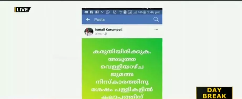 |ഗെയില് സമരത്തിന്റെ മറവില് കലാപം നടത്താന് മുസ്ലിം പള്ളികള് കേന്ദ്രീകരിച്ച് ശ്രമം നടക്കുന്നുവെന്ന സിപിഎം നേതാവിന്റെ ഫേസ് ബുക്ക് സന്ദേശത്തിനെതിരെ പൊലീസില് പരാതി