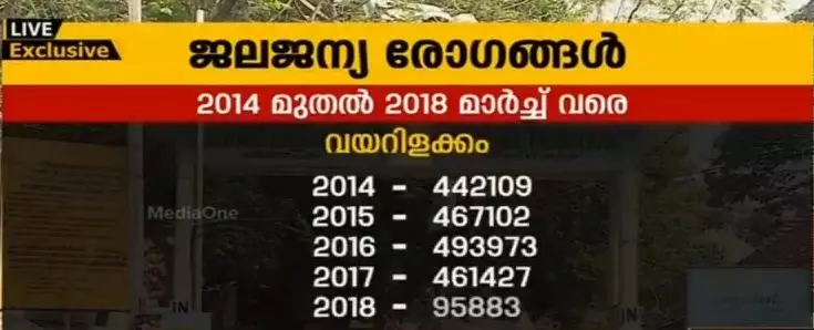 കഴിഞ്ഞ അഞ്ച് വര്ഷത്തെ കണക്കുകള് പരിശോധിക്കുമ്പോള് ജലജന്യരോഗങ്ങള് കൂടിവരുന്നതായി കാണാം. 2014 മുതല് 2017 വരെ കോളറ റിപ്പോര്ട്ട് ചെയ്തിട്ടുണ്ട്. ഒപ്പം മരണവും. വയറിളക്കരോഗവും കൂടുതലാണ്. 2014 മുതല് 2017 വരെ ഓരോ വര്ഷവും നാലര ലക്ഷത്തിന് മുകളില് ആളുകള് വയറിളക്ക രോഗത്തിന് ചികിത്സ തേടി.