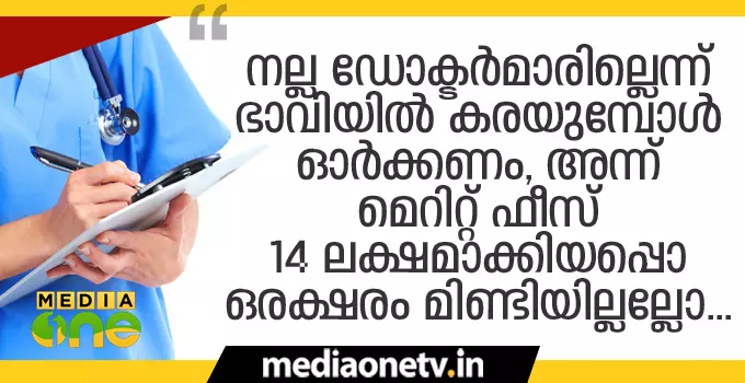 നല്ല ഡോക്ടര്മാരില്ലെന്നും സാധാരണക്കാരെ മനസിലാക്കുന്നില്ലെന്നുമൊക്കെ ഭാവിയില് കരയുമ്പൊ ഇതൂടെ ഓര്മ വേണം... അന്ന് പി.ജി മെറിറ്റ് ഫീസ് 14 ലക്ഷമാക്കിയപ്പൊ ഒരക്ഷരം മിണ്ടിയില്ലല്ലോ എന്ന്.