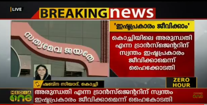അരുന്ധതി എന്ന ട്രാന്സ്ജെന്ഡറിന് സ്വന്തം ഇഷ്ടപ്രകാരം ജീവിക്കാമെന്ന് ഹൈക്കോടതി