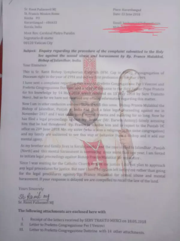 ജലന്ധര് ബിഷപ്പിനെതിരെ കന്യാസ്ത്രീ പരാതി പറഞ്ഞില്ലെന്ന സഭയുടെ വാദം പൊളിഞ്ഞു