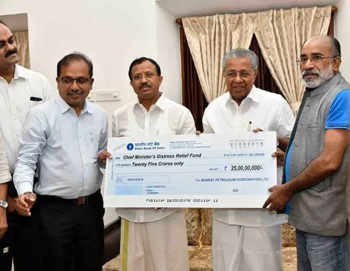 |മുഖ്യമന്ത്രിയുടെ ദുരിതാശ്വാസ നിധിയിലേക്ക് ബി.ജെ.പി കേന്ദ്രമന്ത്രിമാരും എംപിമാരും 25 കോടി സംഭാവന ചെയ്തെന്ന പ്രചാരണം പൊളിച്ചടുക്കി സോഷ്യല് മീഡിയ. ഭാരത് പെട്രോളിയം 25 കോടിയുടെ ചെക്ക് കൈമാറുന്ന ചിത്രമാണ് ബിജെപി അനുകൂലികള് വ്യാജ പ്രചാരണത്തിന് ഉപയോഗിച്ചത്. ബി.ജെ.പി കേന്ദ്ര മന്ത്രിമാരും എം.പിമാരും സംഭാവന നല്കുന്നു എന്ന് പറഞ്ഞാണ് വ്യാജ വാര്ത്ത പടച്ചുവിട്ടത്. മുഖ്യമന്ത്രിയുടെ ദുരിതാശ്വാസ നിധിയിലേക്ക് ഭാരത് പെട്രോളിയം നല്കുന്ന ചെക്കും ചിത്രവും ഉപയോഗിച്ചായിരുന്നു ഈ കളി.
