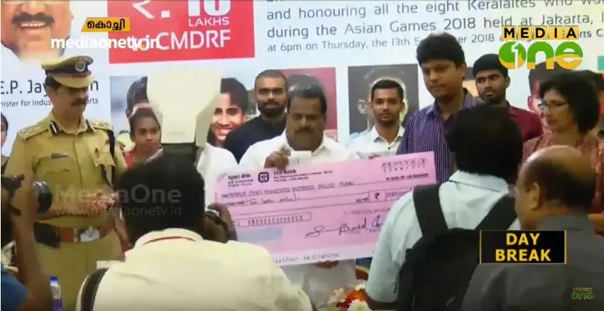 |കൊച്ചി കടവന്ത്രയില് നടന്ന യോഗത്തില് ജില്ലാകളക്ടര് മുഹമ്മദ് വൈ സഫറുള്ള മന്ത്രി ഇ.പി ജയരാജന് തുക കൈമാറി. ഏഷ്യന് ഗെയിംസില് ജേതാക്കളായ എട്ട് കായികതാരങ്ങളെയും ചടങ്ങില് അനുമോദിച്ചു.