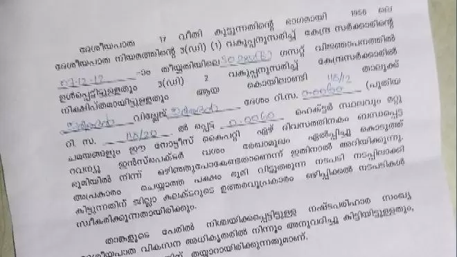 |7 ദിവസത്തിനകം റവന്യൂ ഇന്സ്പെക്ടറുടെ കൈവശം രേഖാമൂലം ഭൂമിയുടെ വിവരങ്ങള് ഏല്പ്പിച്ച് ഒഴിഞ്ഞ് പോകണമെന്നാണ് നോട്ടീസ്. ഇല്ലെങ്കില് ഒഴിപ്പിക്കുമെന്നുമാണ് മുന്നറിയിപ്പ്.