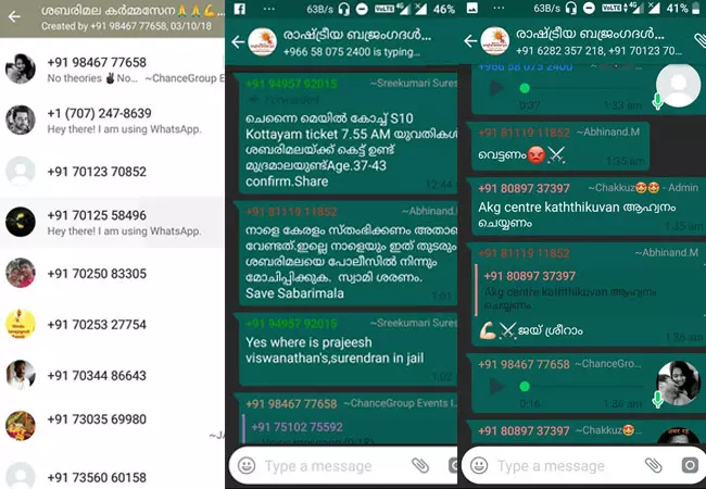 ശബരിമല കര്മ്മസേന എന്ന ഗ്രൂപ്പ് വഴിയാണ് ആര്.എസ്.എസ്-ബി.ജെ.പി പ്രവര്ത്തകര് കലാപത്തിന് ആഹ്വാനം ചെയ്യുന്നത്. കലാപം അഴിച്ചു വിടുന്നതിനൊപ്പം സി.പി.എം പ്രവര്ത്തകരുടെ വീടുകള് അടക്കം കത്തിക്കുവാനും ഗ്രൂപ്പില് ആഹ്വാനമുണ്ട്.