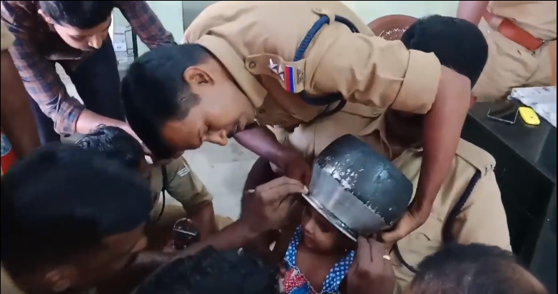 അലുമിനിയം കുടത്തിനുള്ളില് തല കുടുങ്ങിയ ഒന്നര വയസ്സുകാരിയെ രക്ഷപ്പെടുത്തി ഫയര് ഫോഴ്സ്: വീഡിയോ