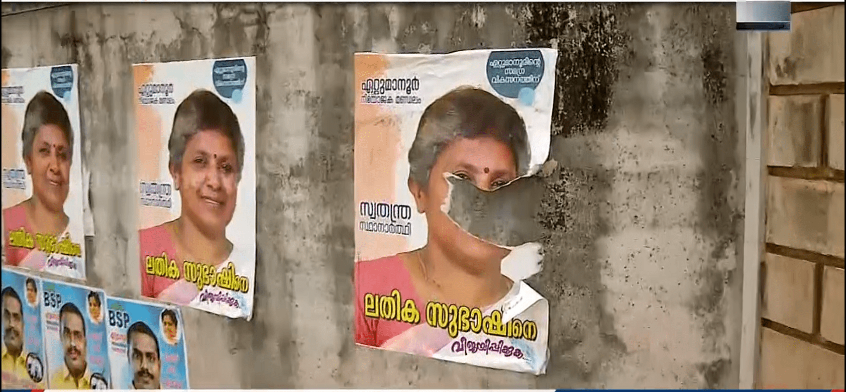 തെരഞ്ഞെടുപ്പ് പോസ്റ്ററുകൾ വ്യാപകമായി നശിപ്പിക്കുന്നതിനെതിരെ പരാതിയുമായി ഏറ്റുമാനൂരിലെ സ്വതന്ത്ര സ്ഥാനാർഥി ലതിക സുഭാഷ്. ചെങ്ങളം, ഒളശ മേഖലകളിലാണ് ലതിക സുഭാഷിന്റെ പോസ്റ്ററുകൾ നശിപ്പിച്ചതായി കണ്ടെത്തിയത്.