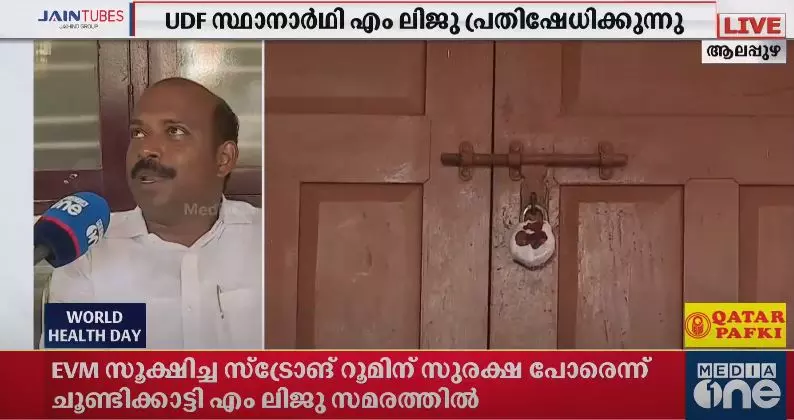 ആലപ്പുഴയില് വോട്ടിങ് യന്ത്രം സൂക്ഷിച്ചിരിക്കുന്ന സ്ട്രോങ് റൂമിന് സുരക്ഷ പോരെന്ന് ചൂണ്ടിക്കാട്ടി യുഡിഎഫ് സ്ഥാനാർഥി എം ലിജു കുത്തിയിരിപ്പ് സമരത്തില്. സെന്റ് ജോസഫ് സ്കൂളിലെ സൂക്ഷിപ്പ് കേന്ദ്രത്തിലാണ് സമരം. സ്ട്രോങ് റൂം പലക ഉപയോഗിച്ച് അടച്ചുപൂട്ടി സീല് ചെയ്തിട്ടില്ല എന്നാണ് പരാതി.